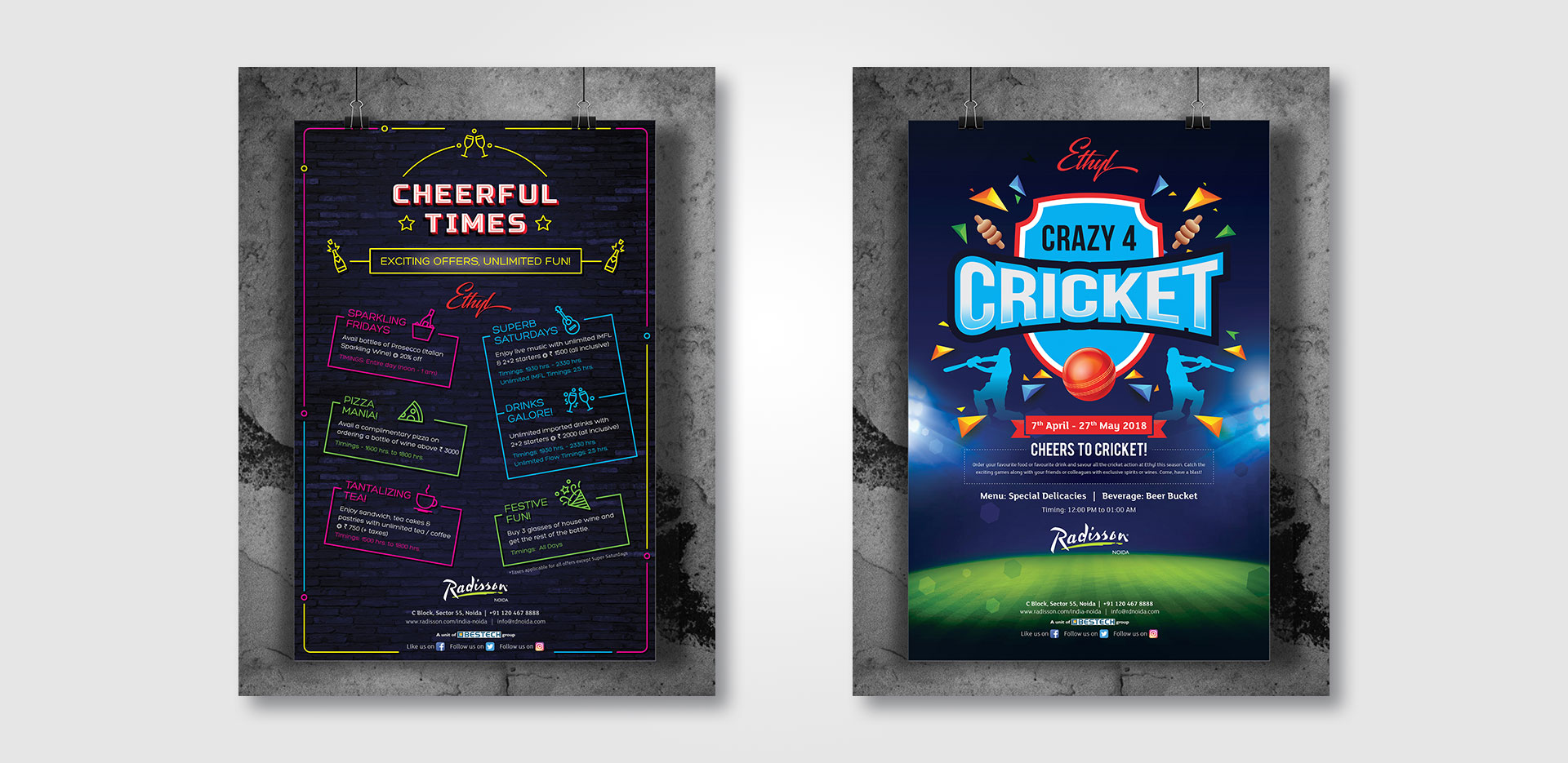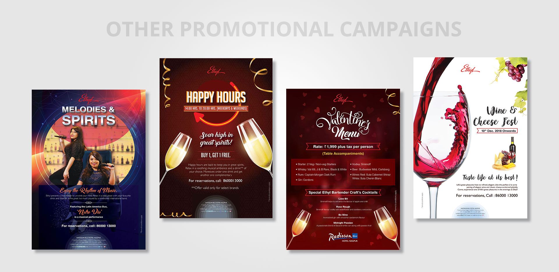 ethyl, the premier bar at radisson hotels indore, noida and nagpur is a patron’s delight. it offers an array of imfl and international spirits and wines in a cozy setting. the year-long promotions are complemented by our insightful communication ideas in the most innovative manner across all media.