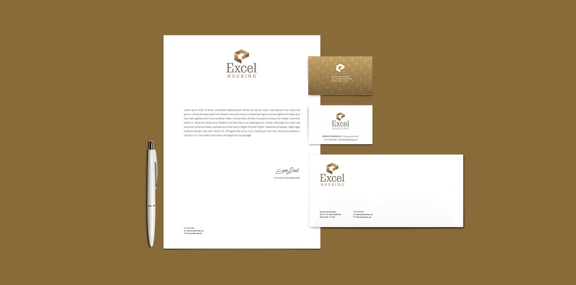 the construction business with many big and small players is quite competitive. for excel housing, the name inspired us to create a logotype that depicts a stylized letter ‘e’ creating an illusion of an edifice. in a nutshell, the name ‘excel housing’, has been justified in a beautiful manner.