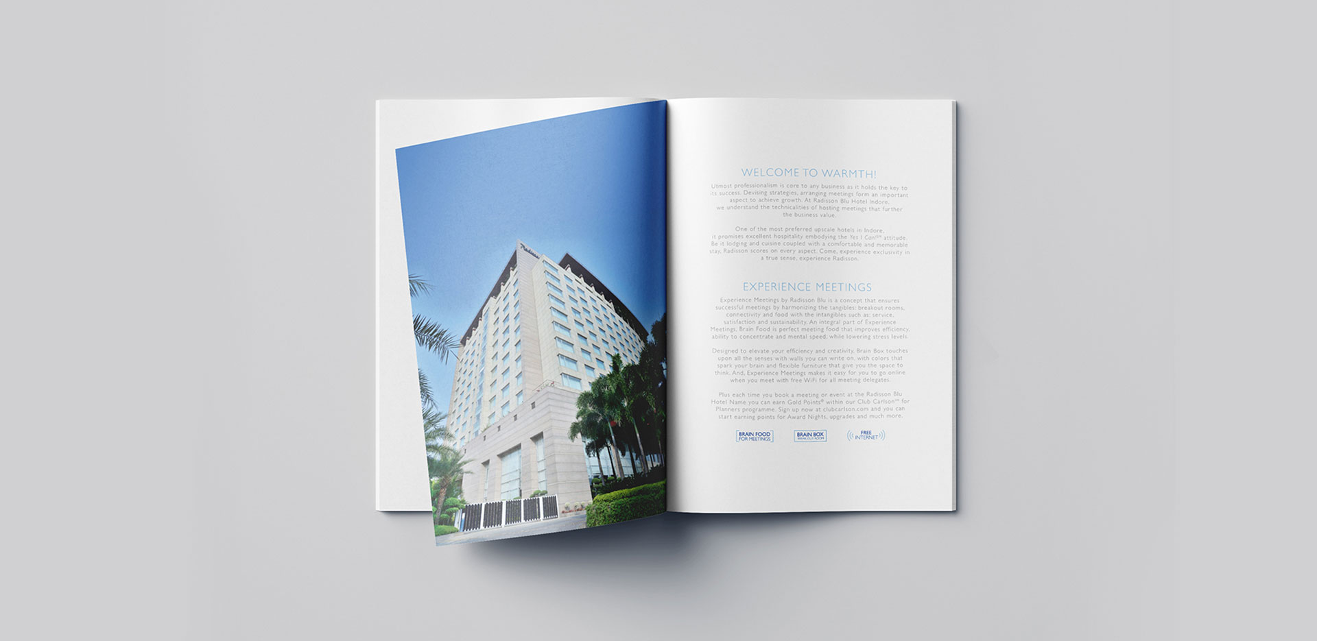 radisson blu hotel indore requested for a unique requirement. an exclusive meeting planner as a part of the marketing strategy to attract the corporate clientele. our team analyzed the entire concept in line with the brand guidelines with engaging copy and well-laid out design.
